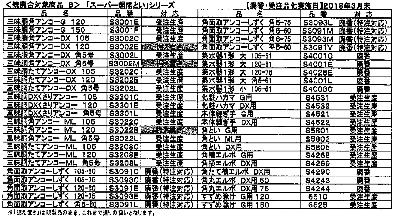 統廃合対象商品B 廃盤・受注商品化 スーパー銅雨といシリーズ アンコー・集水器系列