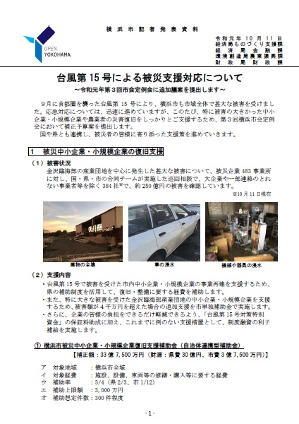 高木からのお知らせ 横浜市台風15号被災支援資料 2019年10月18日 横浜市経済局より台風第15号被災支援対応について発表がありましたので、連携いたします。 以下抜粋で文字起こししましたが、詳細は添付の画像をご覧ください。 1被災中小企業の復旧支援 ①横浜市被災中小企業・小規模企業復旧支援補助金(自治体連携型) 対象地域 横浜市全域 対象経費 施設、設備、車両等の修繕・購入等に要する経費...