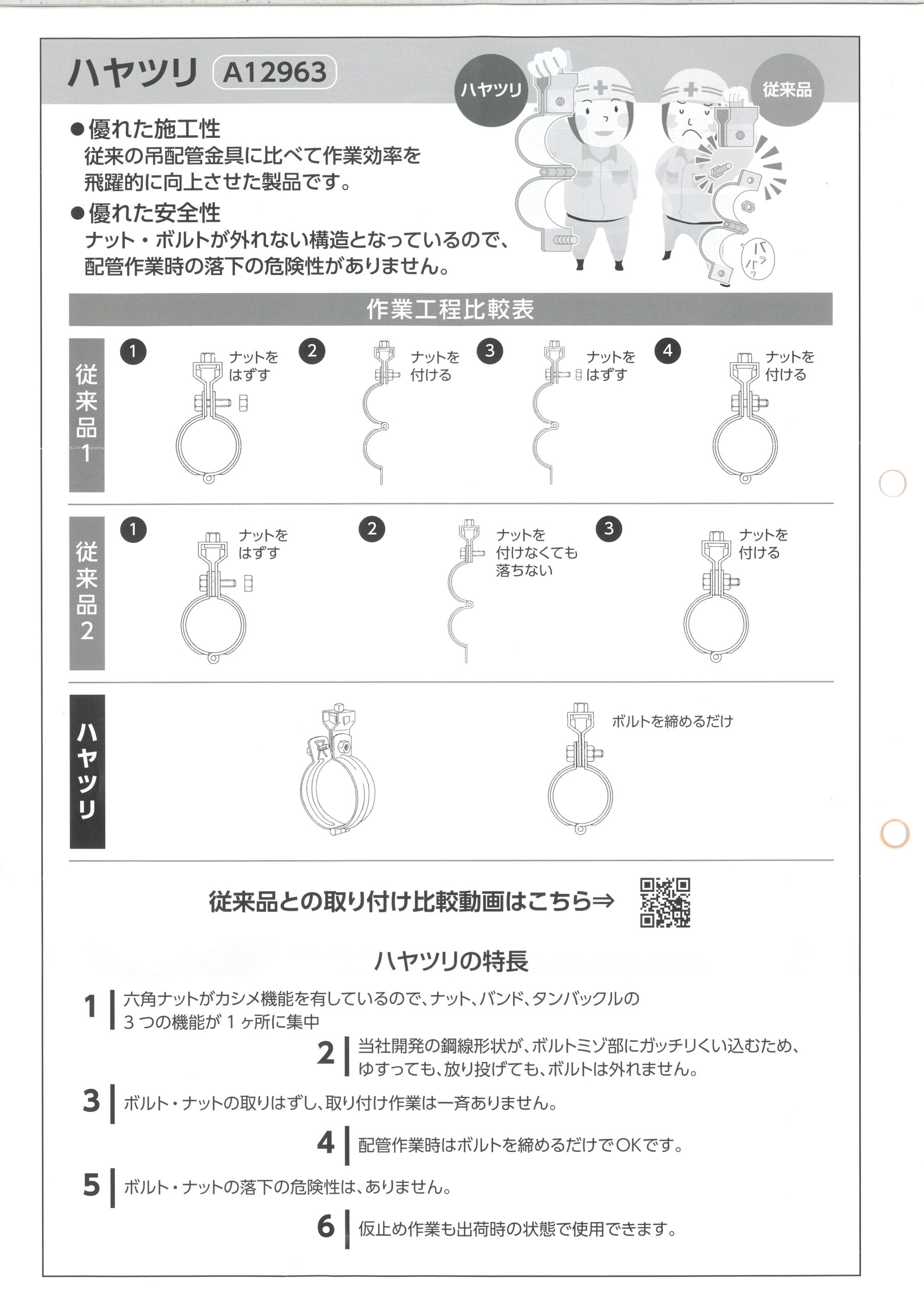 ナット・ボルトが外れない構造となっているので、配管作業時の落下の危険性がありません。