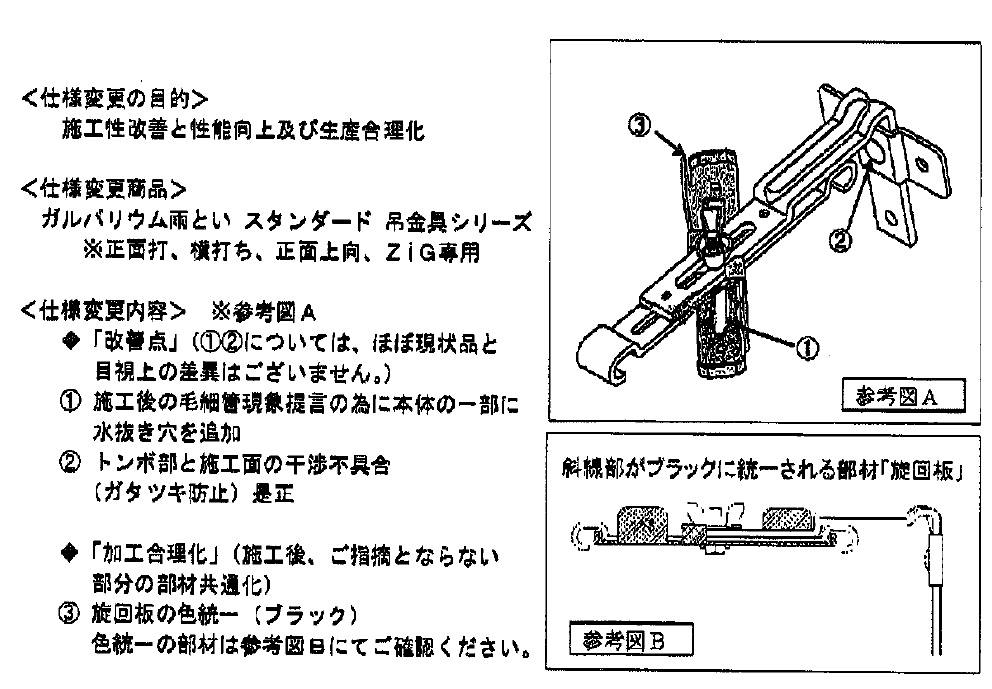 仕様変更・受注生産 タニタハウジングウェアガルバリウム雨といZiG 吊り金具仕様変更 タニタハウジングウェア 2018年6月18日 株式会社タニタハウジングウェア(https://www.tanita-hw.co.jp/)より通知がありましたのでご紹介いたします。 ZiG専用のガルバリウム雨といスタンダード吊金具の仕様変更です。 施工後の毛細管現象提言のために本体の一部に水抜き穴を追加 トンボ部と施工面の干渉不具合是正 旋回板の色統一 2018年...