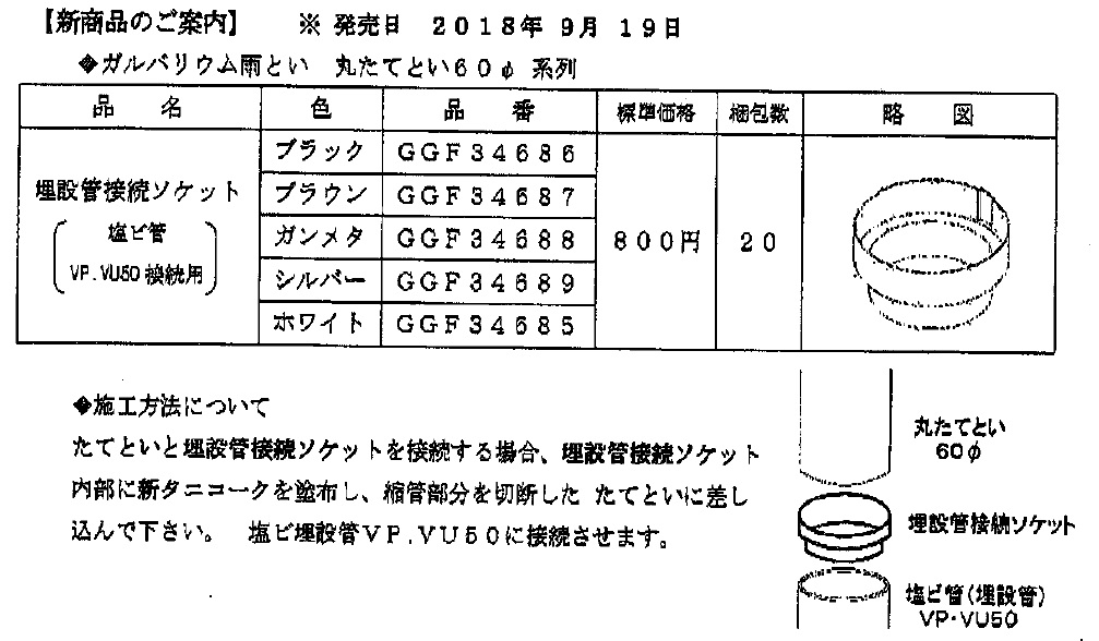 新製品・新サービス タニタハウジングウェアガルバリウム雨とい 新商品 埋設管接続ソケット タニタハウジングウェア 2018年9月10日 株式会社タニタハウジングウェア(https://www.tanita-hw.co.jp/)より通知がありましたのでご紹介いたします。 ガルバリウム雨とい 丸たてとい60Φ系列の埋設管接続ソケットが新発売となります。 対象埋設管はVP・VU50。...